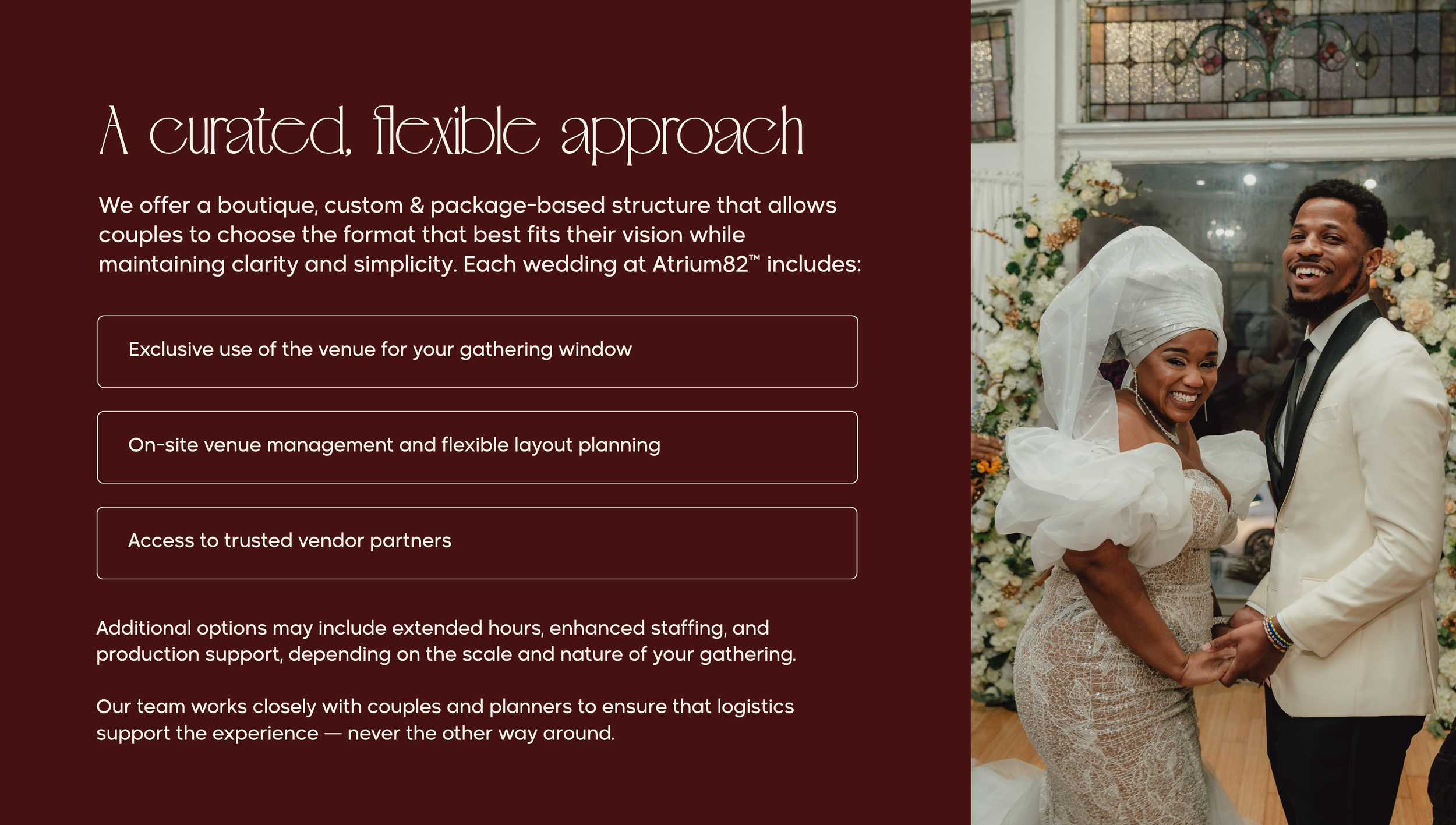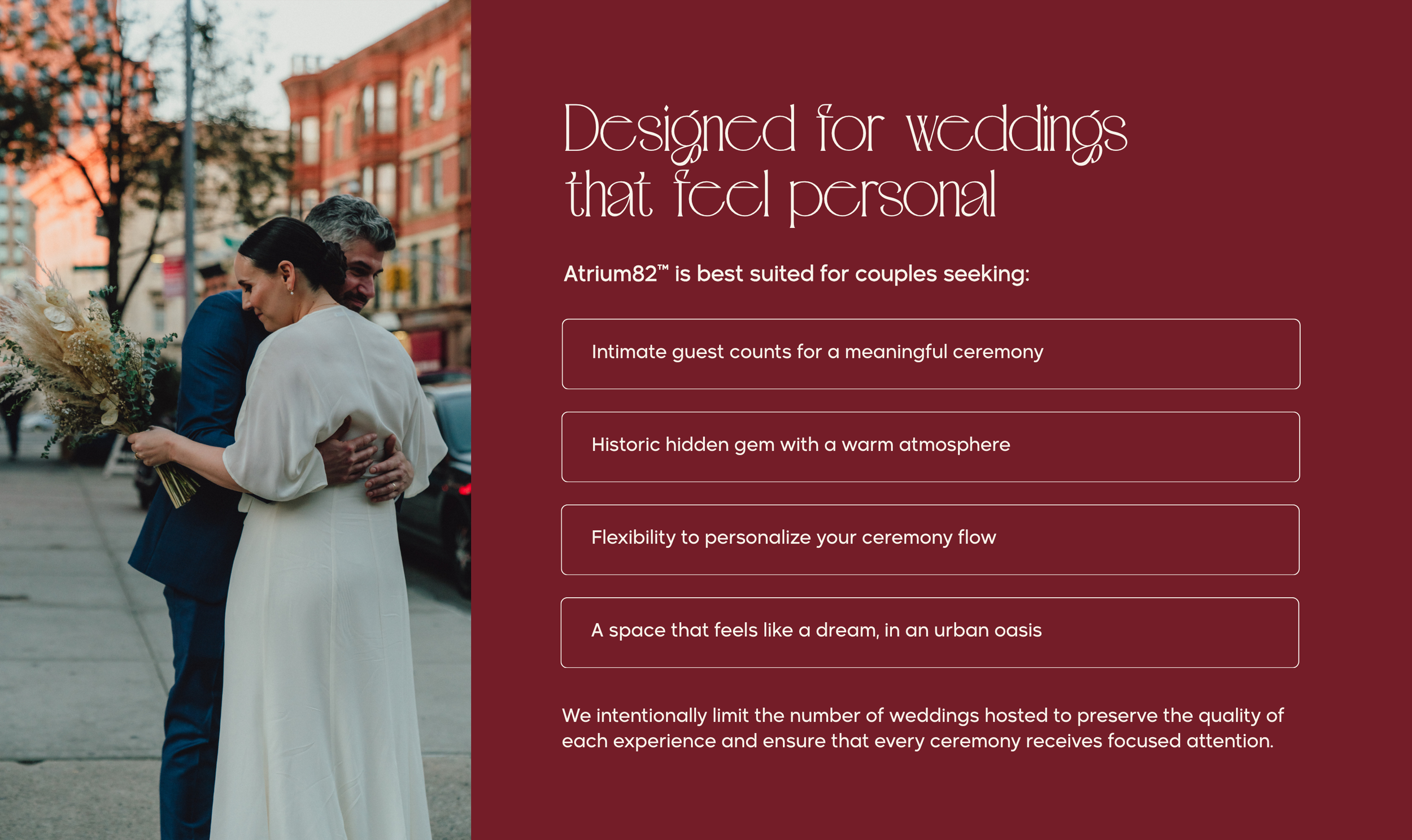Weddings at Atrium82™ are guided by texture, proportion, and atmosphere. The venue blends classic Brooklyn architecture with natural elements, creating a setting that feels refined yet approachable. Exposed wood, soft neutral tones, and filtered daylight allow florals, fabrics, and people to take center stage.